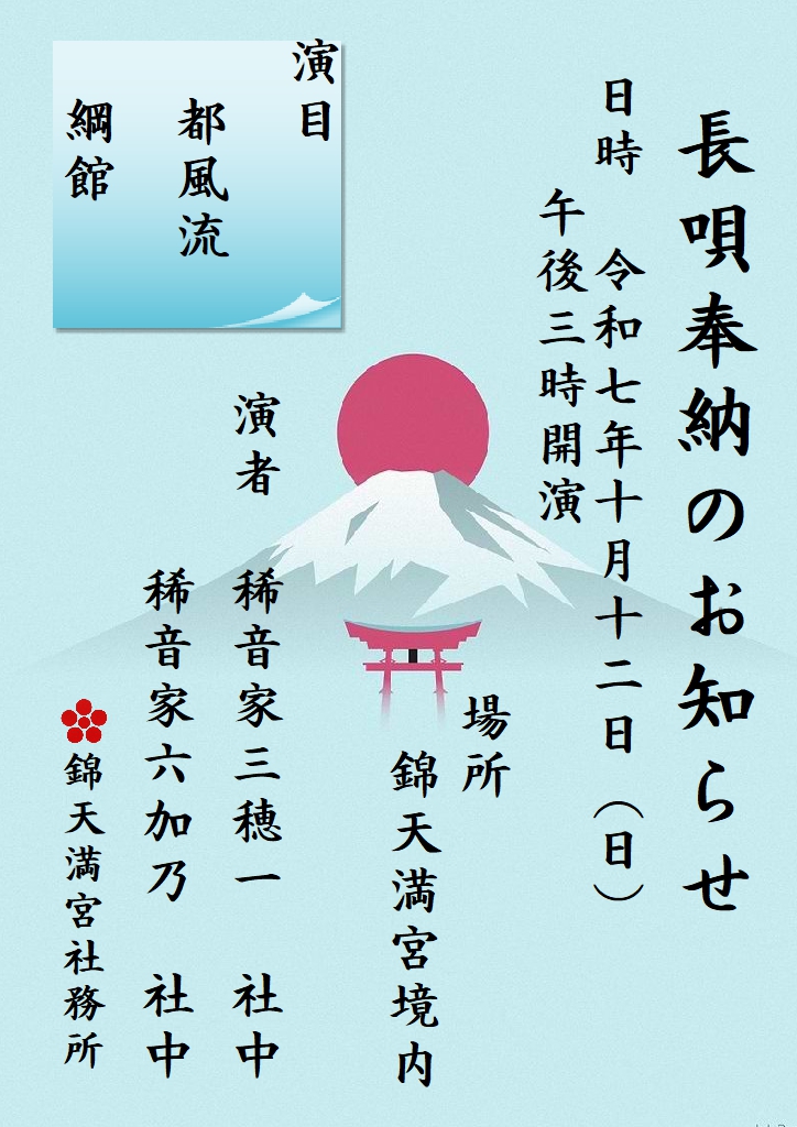 お知らせ2025年 10月06日第十二回長唄奉納のお知らせ令和7年10月12日(日)午後3時より毎月恒例の長唄奉納が行われます。この機会に長唄に触れて頂き、午後のひと時をお楽しみください。詳細は以下の通りです。