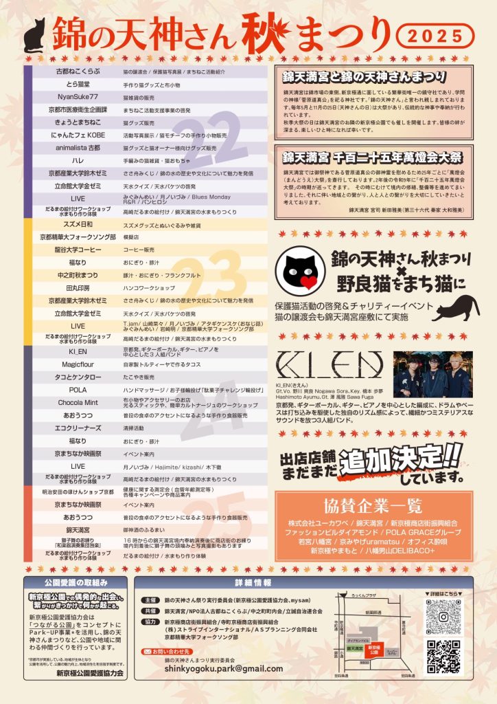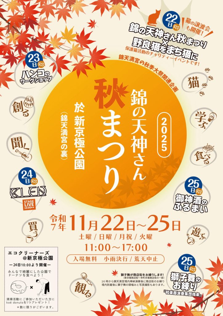 お知らせ2025年 11月11日2025 錦の天神さん秋まつりのお知らせ令和7年11月25日、当社の秋季大祭を斎行致しますが、関連企画としてお隣の新京極公園で22日(土)~25日(火)の期間中に恒例の「錦の天神さんまつり」が実行委員会主催で開催されます。是非お誘いあわせの上、ご参拝頂き、イベントにもご参加ください。今回は中之町町内会秋まつりの同時開催をはじめ、地域の多くの皆様のご協力を頂いております。美しい紅葉の季節に皆様の絆が深まりますよう、楽しいひと時をお過ごしください。