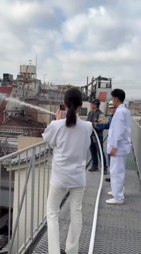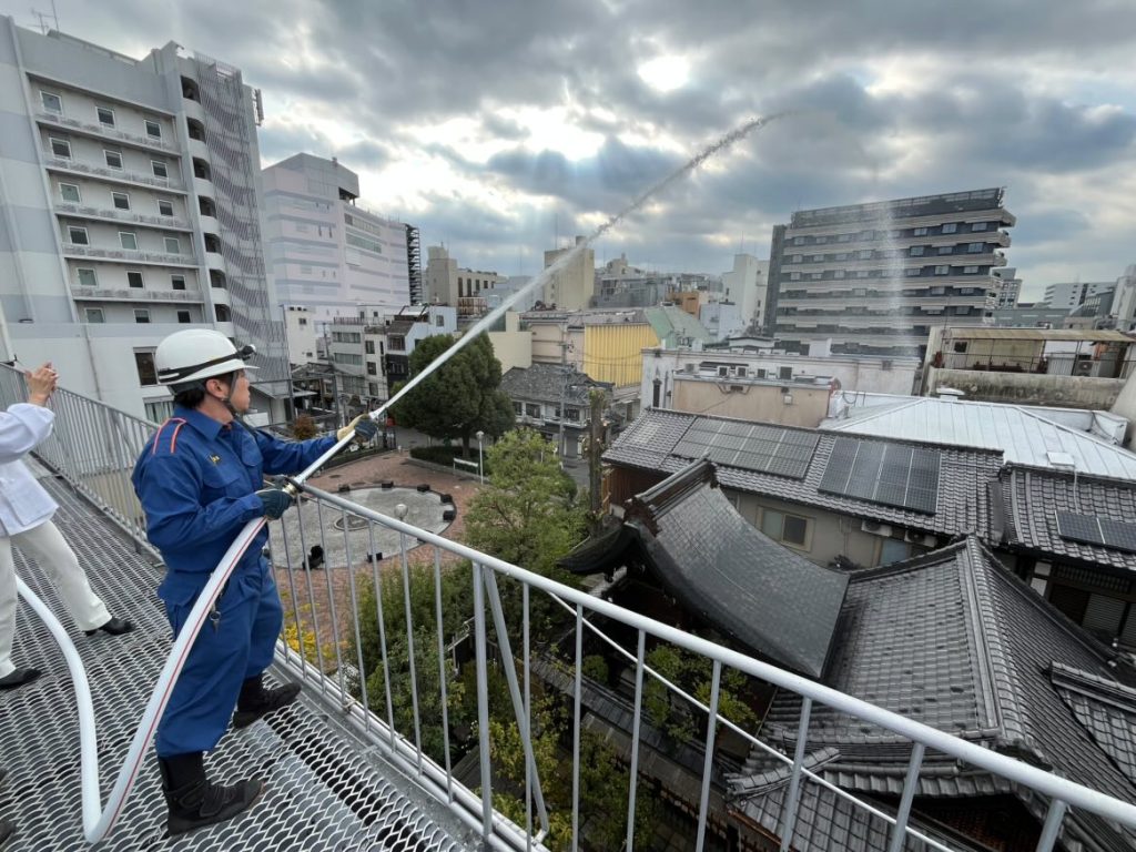 11月17日に当社境内において本格的な放水訓練を行いました。北隣のダイアモンドビル様の消防設備点検の一環としてビル屋上から当社へ放水頂き、本殿並びに拝殿、摂社への安定的な着水を確認しました。