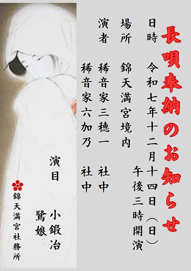 お知らせ2025年 12月03日第十四回 長唄奉納のお知らせ令和七年十二月十四日、午後三時から今年最後の長唄奉納が開催されます。この機会に長唄を身近に感じて頂ければ幸いです。日曜日の午後のひと時を是非お楽しみくださいませ。