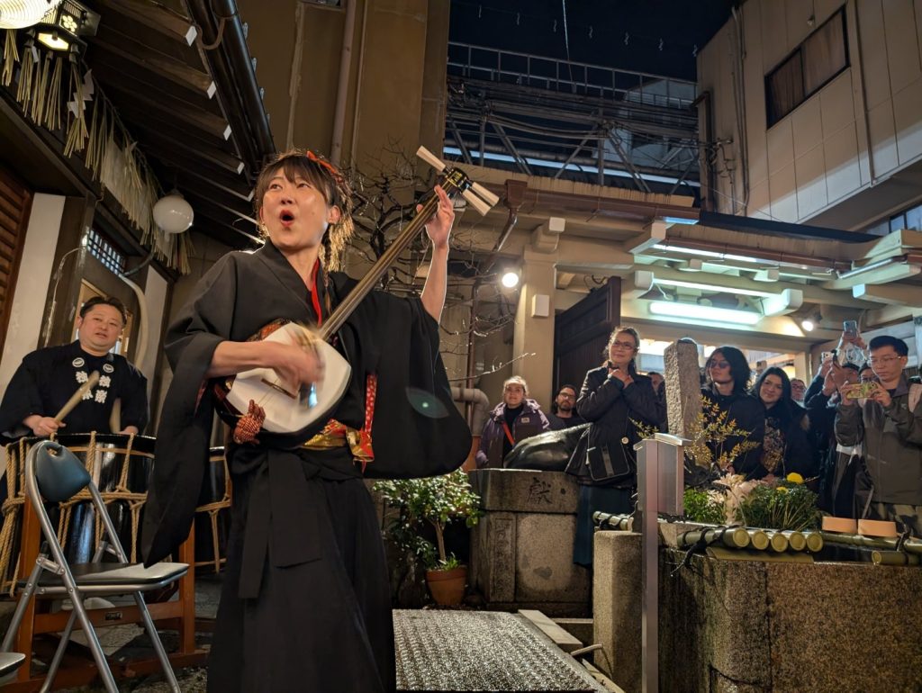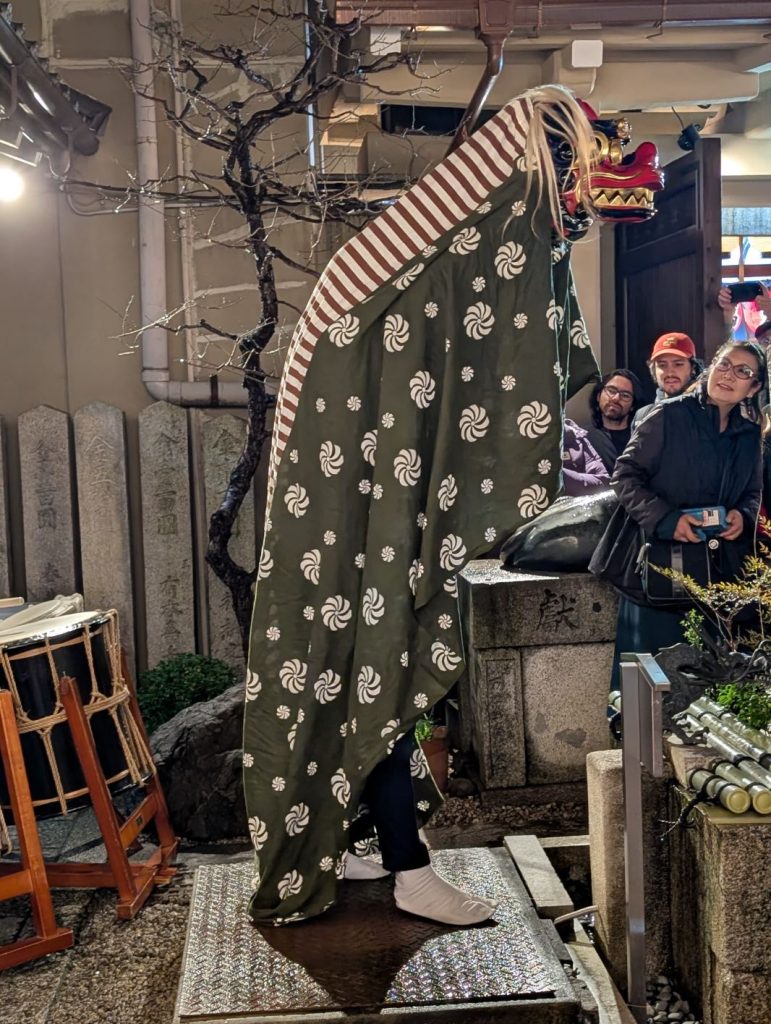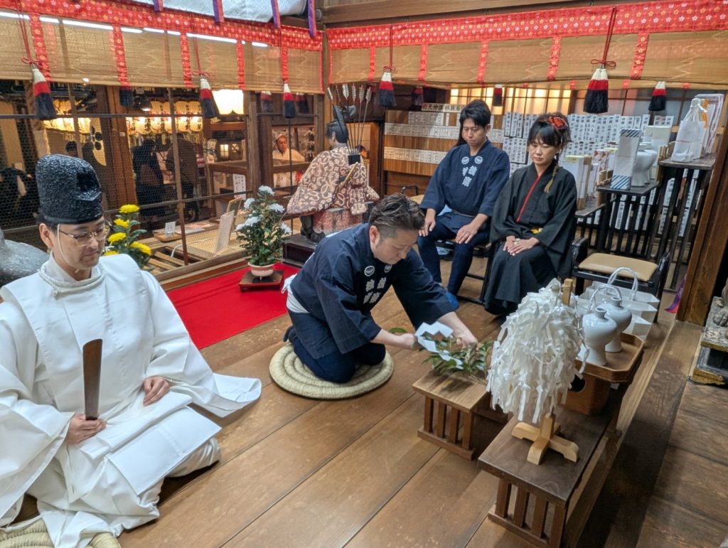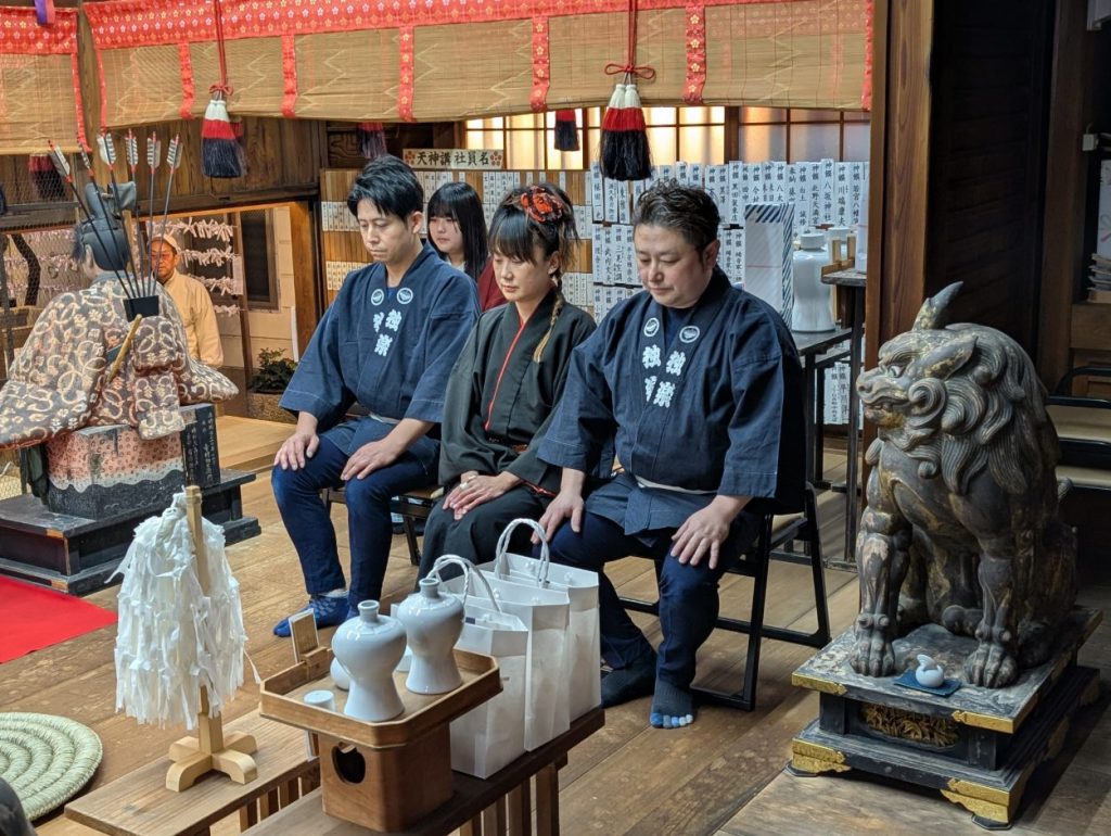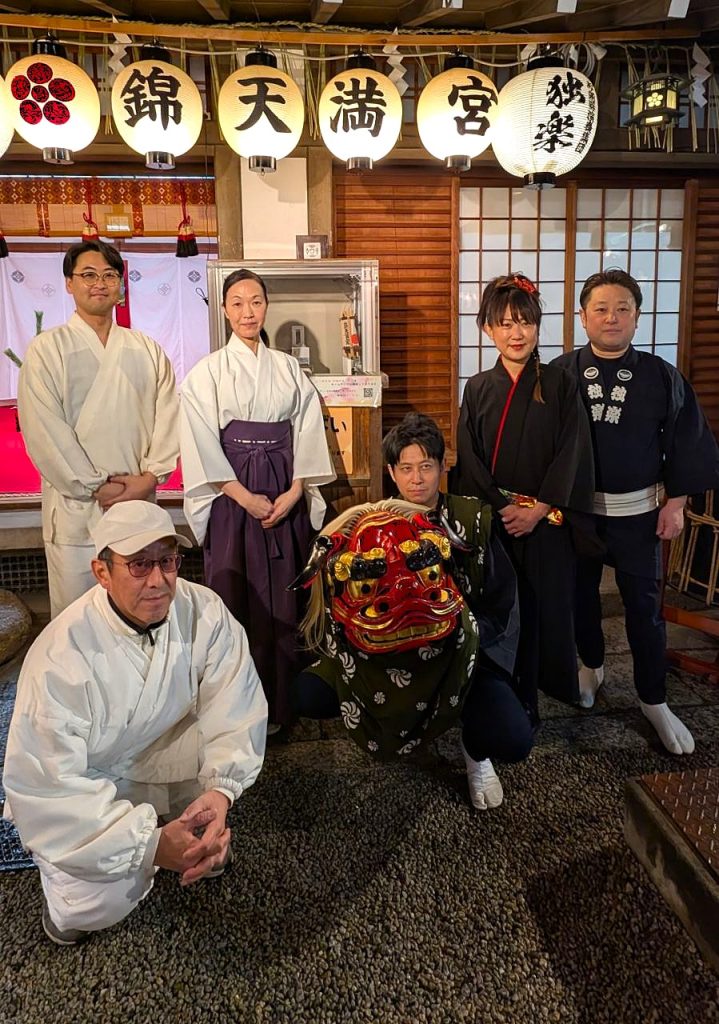 お知らせ2025年 12月27日終い天神 202512月25日は朝からの雨にもかかわらず、たくさんのご参拝を頂いて今年最後の月次祭「終い天神」を斎行致しました。また和楽器演奏集団「独楽」様の和太鼓・獅子舞・三味線奉納は、昇殿正式参拝の後行われ、終い天神は大きな盛り上がりを見せました。今年一年、錦天神講並びに崇敬者の皆様には大変お世話になりました。心より御礼申し上げます。よいお年をお迎えくださいませ。和楽器演奏集団「独楽」様による和楽器・獅子舞奉納遠州正風宗家 芦田一馬宗匠による献花