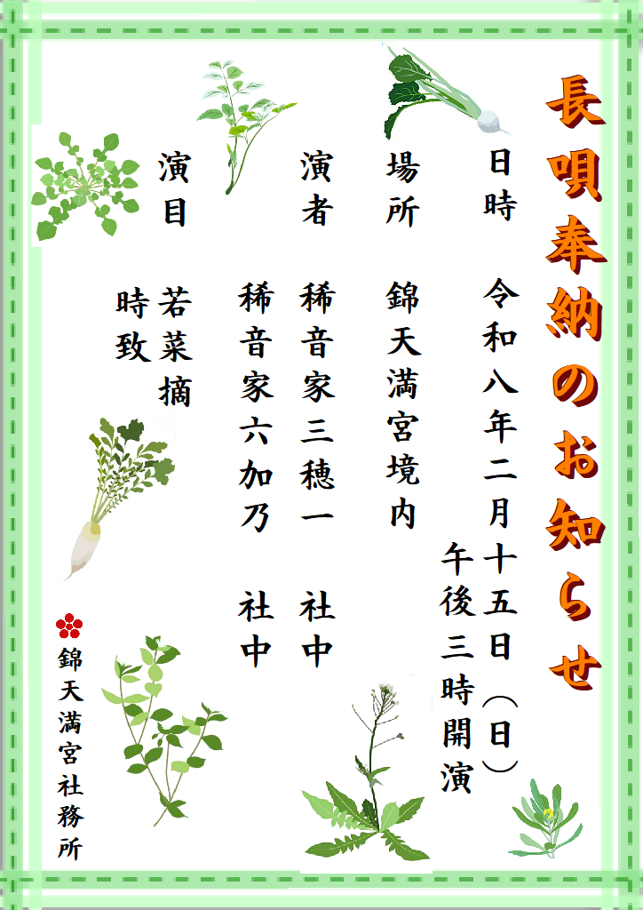 お知らせ2026年 02月05日第16回長唄奉納のお知らせ毎月恒例である長唄演奏の奉納が今月15日に執り行われます。「時致」は曽我の五郎による仇討と郭通いで出会った遊女とのお話、「若菜摘」は日本古来からの謂れである春の七草に関連する演目です。この機会にぜひ長唄に触れて頂き、午後のひと時をお楽しみ下さい。